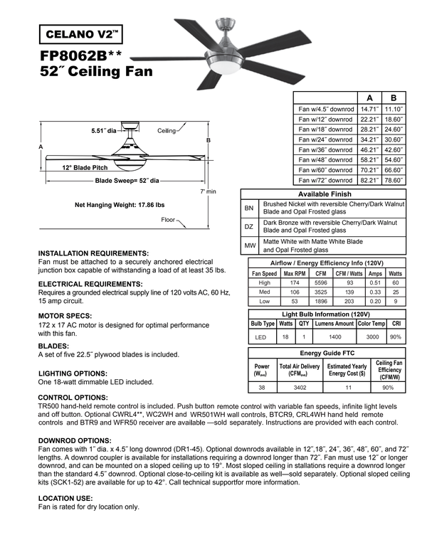 • 3 speed AC motor with reverse switch, fan speed, light controls and sleep timer features