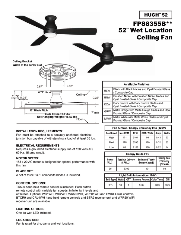 • Set of (3) 44 or 52 inch Wet Rated blades and 18 watt LED light kit with cover and bulbs included