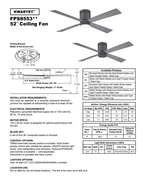 • Set of (4) blades with multiple finishes and (1) 18 watt LED bulb and light kit included